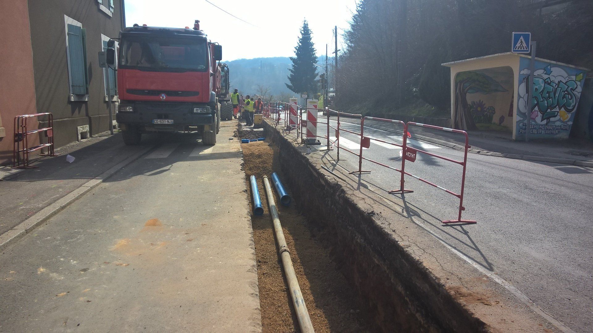 - Travaux sur le réseau de la rue de Longwy avec dévoiement d'un réseau DN150 et le remplacement d'un regard de comptage en sortie de château d'eau